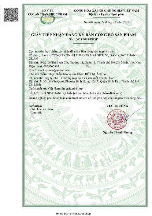 GIẤY CÔNG BỐ TIÊU CHUẨN SẢN PHẨM TRÁI NHÀU ( NONI ) THANH QUÂN